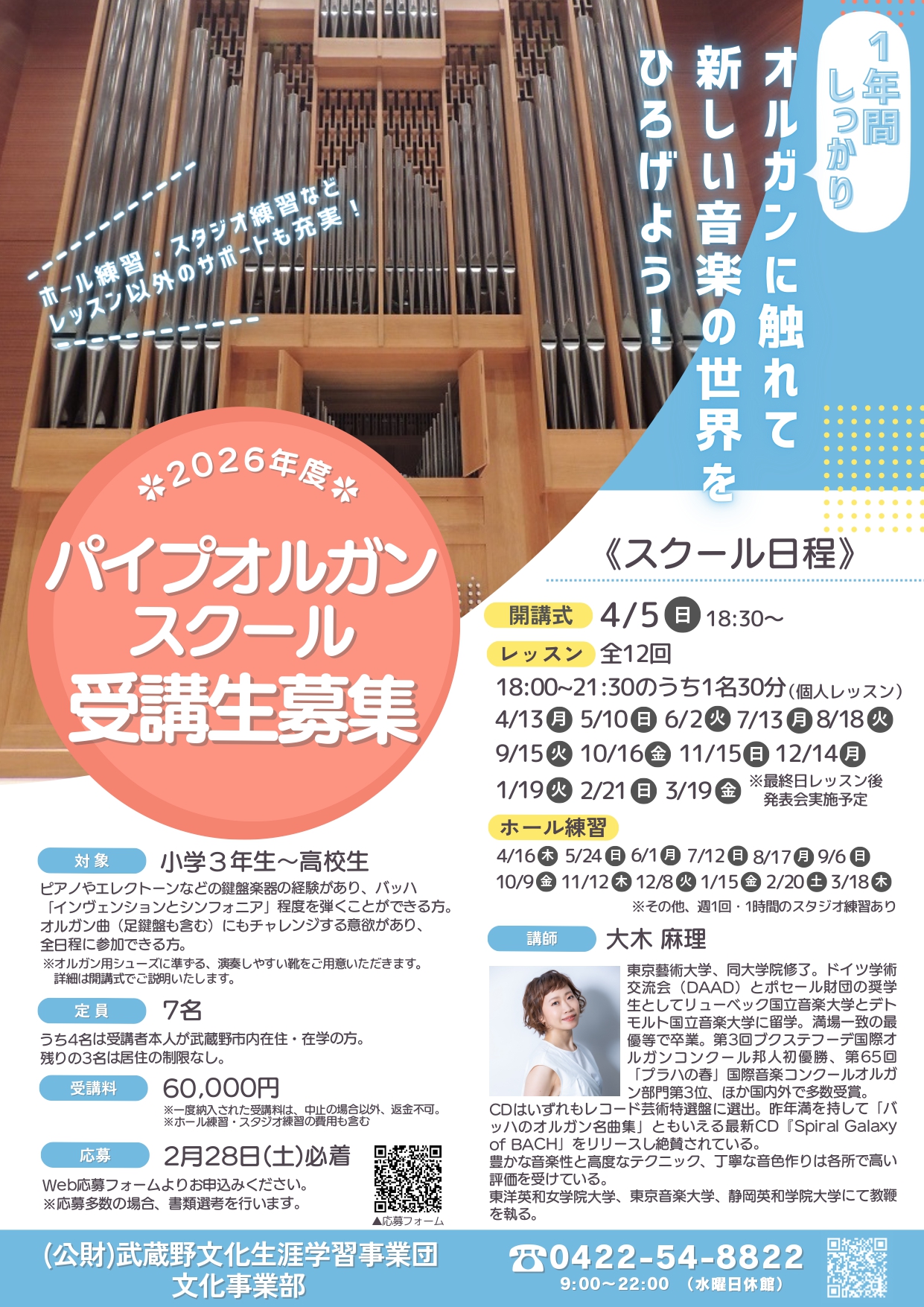 そして教室といえば!武蔵野市民文化会館でも、パイプオルガン・スクールの受講生を募集しています!!