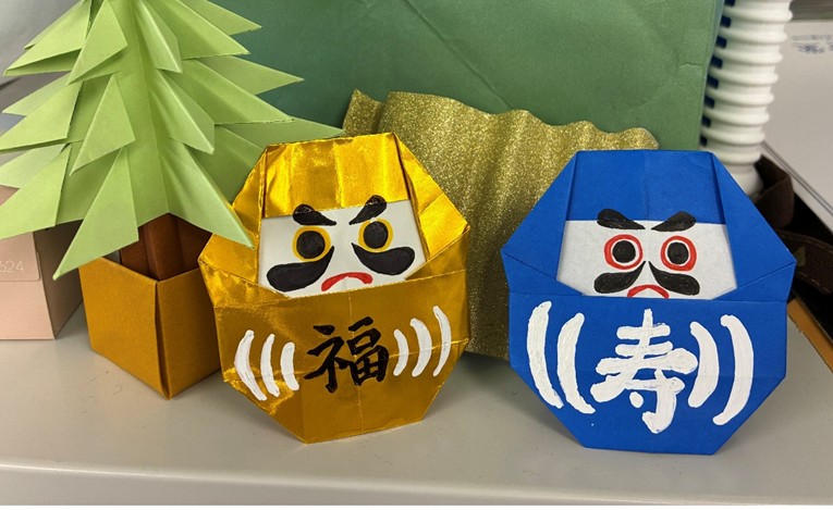 さて、公会堂の受付カウンターには季節の折り紙が飾ってあることが多いのですが、事務所内のキャビネットの上には、長男ダルマ(金)と末っ子ダルマ(青)がいます。そう、このお二方です。