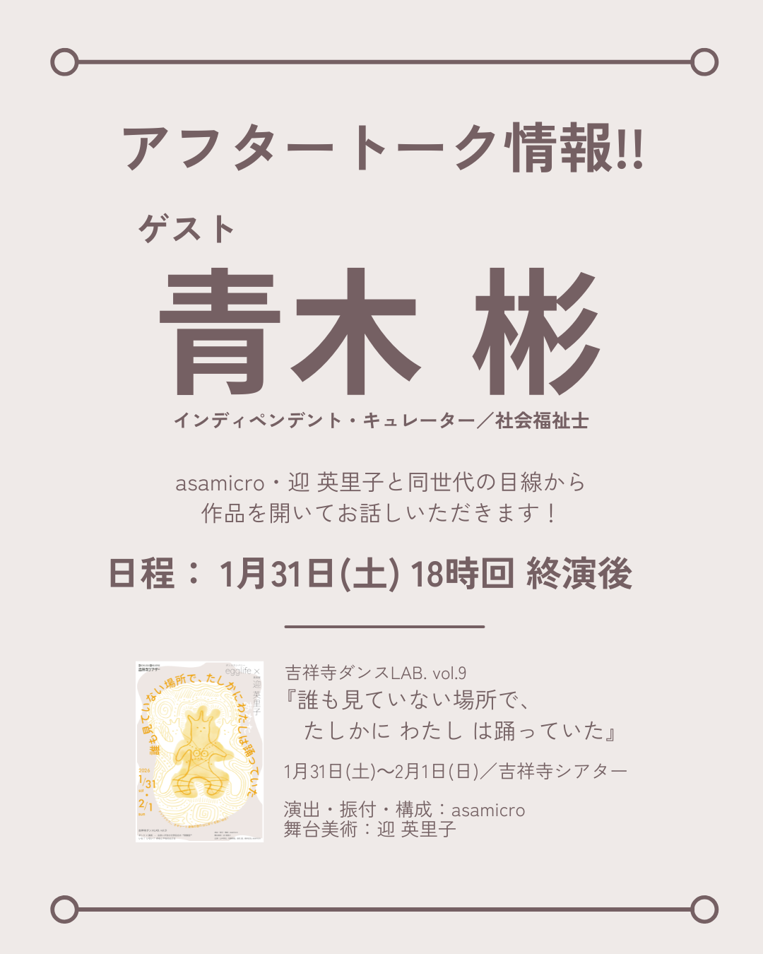 誰おどのひとコマ投稿中! 2026 1/20 vol.9 誰おど 誰おどのひとコマ 2026年1月19日2026年1月20日 吉祥寺ダンスLAB. vol.9『誰も見ていない場所で、たしかに わたし は踊っていた』短いドキュメンタリー動画で、創作の道のりを追っていく、 #誰おどのひとコマ吉祥寺シアターの公式X&Instagramで連載中! チケットを予約する(外部リンク) vol.9 誰おど 誰おどのひとコマ URLをコピーしました! アフタートークゲスト公開! egglife過去公演『のこりもの』ダイジェスト公開!
