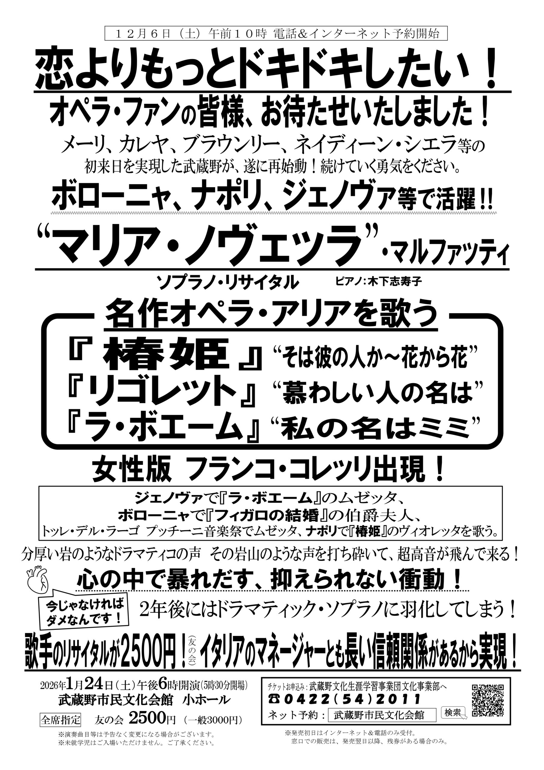 予定枚数終了 インターネット予約 ※インターネット購入方法が分からない方はこちら!! 電話予約 2026年度、武蔵野でオペラはこの一回だけ!なのだ!!ウィーン国立歌…